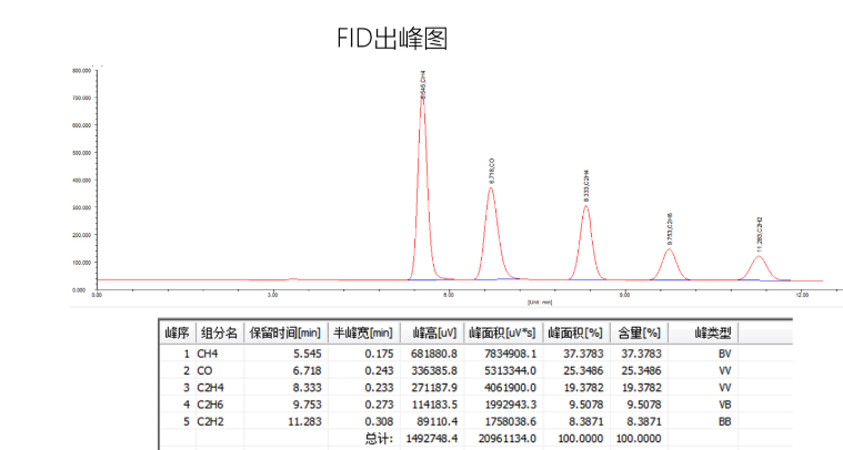 以氬氣為載氣前裝置六通閥進(jìn)樣經(jīng)色譜儀六通閥相連的預(yù)處理柱進(jìn)行分離,在氫氣,氧氣,氮?dú),甲烷,一氧化碳進(jìn)入5A分子篩柱而CO2未出預(yù)處理柱前六通閥反吹出的二氧化碳及碳、乙烯、丙烷等進(jìn)入FID2充檢測(cè)柱,由FID2測(cè)器檢出碳二碳三烴烷類,而經(jīng)5A柱分離的氫氣,氧氣,氮?dú),甲烷,一氧化碳進(jìn)入TCD檢測(cè)器,檢出氫氣,氧氣,氮?dú)猓粯悠窔庠俳?jīng)轉(zhuǎn)化爐進(jìn)FID檢出甲烷,一氧化碳。另一路經(jīng)RB-WAX毛細(xì)FID1檢出醇、醛、酸等液態(tài)產(chǎn)物。