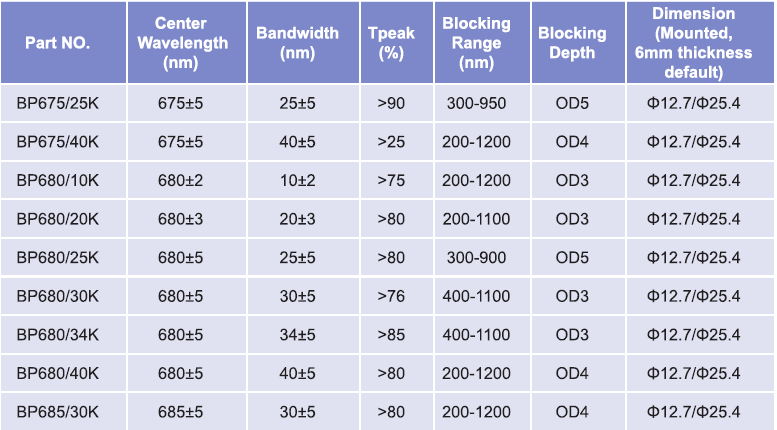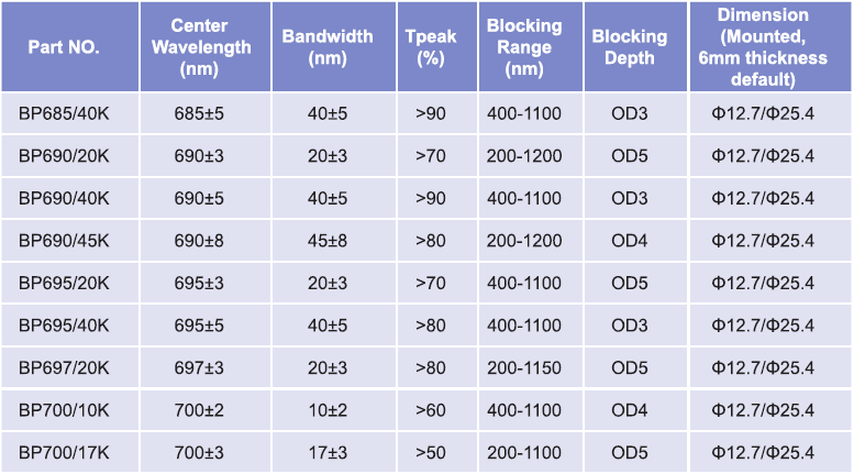 帶通濾光片波長(zhǎng)范圍:685nm-700nm