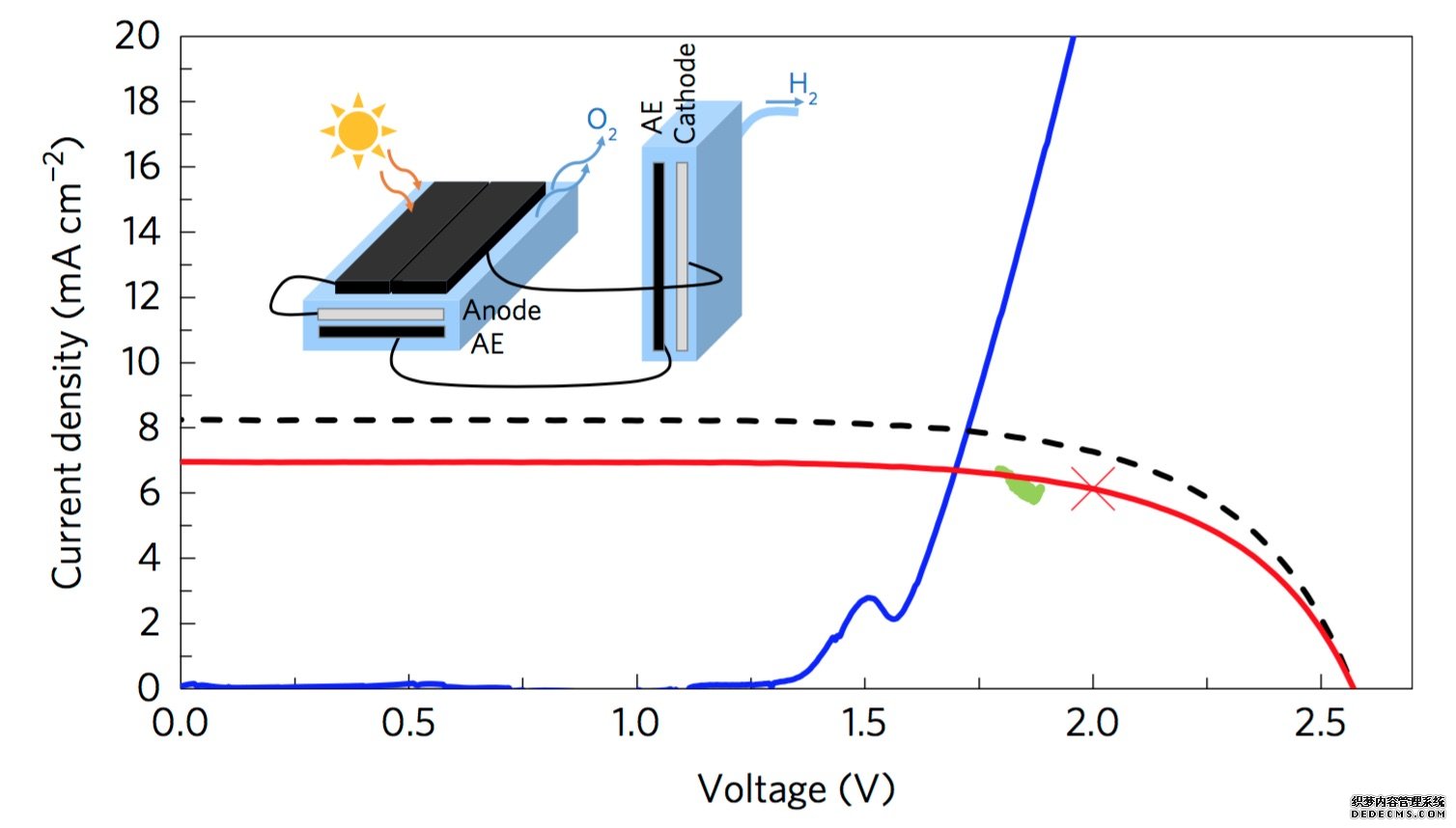 Figure 3 | Solar water splitting system with separate oxygen and hydrogen cells. Current density–voltage (JV) characteristics of the individual components, the PV module (red curve) and water electrolysis system (blue curve), and the operation points of the coupled PV–electrolysis system (green dots). The red X marks the maximum power point of the PV module. The black dashed line curve shows the JV characteristics of a PV module of the same model based on the vendor’s specifications. The inset shows a schematic illustration of the system.