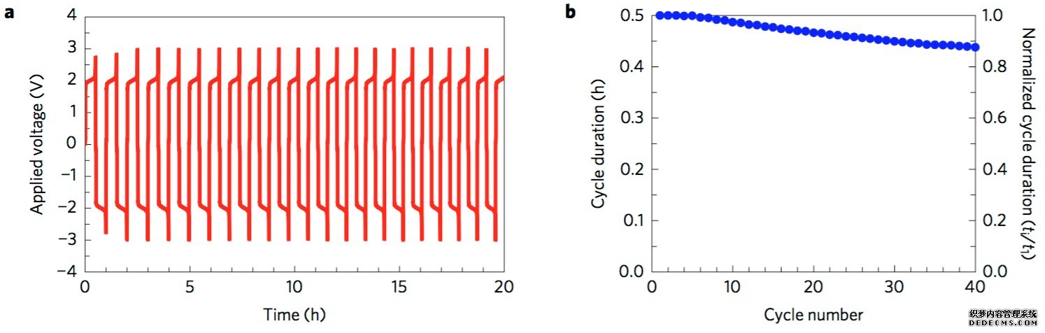 Figure 2 | Two-cell water electrolysis cycles in separate hydrogen and oxygen cells. a, Vappl as a function of time during 20 h of operation at a constant current of 45 mA (5 mA cm2 ). b, The cycle duration plotted against the cycle number. The measurement was carried out in 1 M NaOH alkaline aqueous solution at ambient temperature.