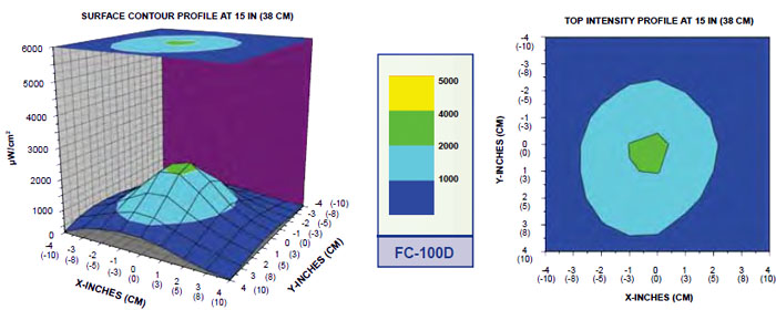 FC-100配聚光濾色片,紫外強(qiáng)度達(dá)5000µW/cm²(在15"/38cm距離)?br> FC-100D配散光濾色片,紫外強(qiáng)度達(dá)2200µW/cm²(在15"/38cm距離)。